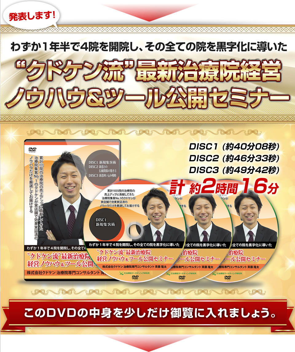 この様な現実を少しでも何とかしたいと想い、僕は今回、クドケンの院経営のノウハウの裏側を完全公開したDVD教材を出しました。