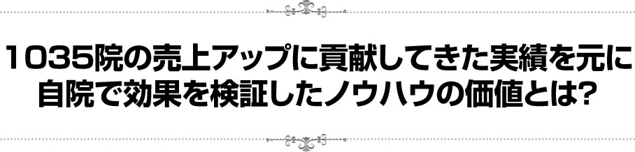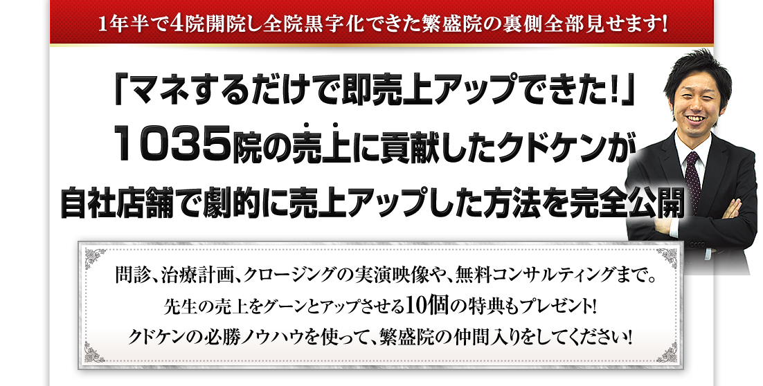 大切なので繰り返しますが、今回お伝えするノウハウは、累計1035の治療院の売上アップに貢献したクドケンが、自らの院でも行い、売上アップの効果を実証したノウハウです。