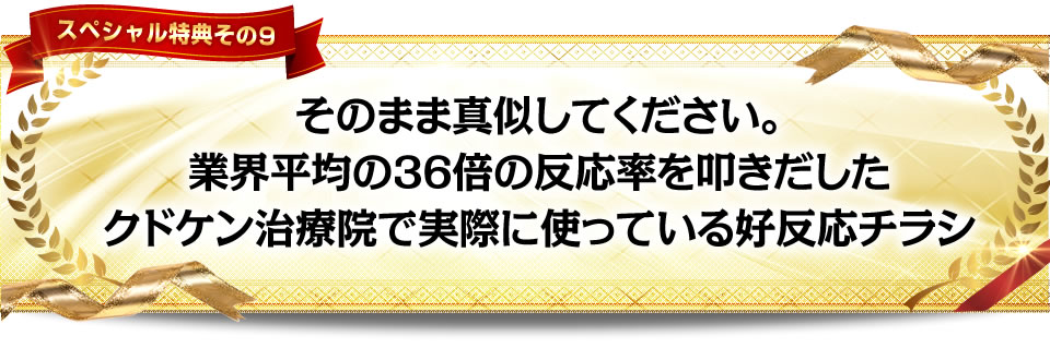 クドケン治療院で、業界平均の36倍の反応率を叩きだしたチラシをそのままプレゼントします。