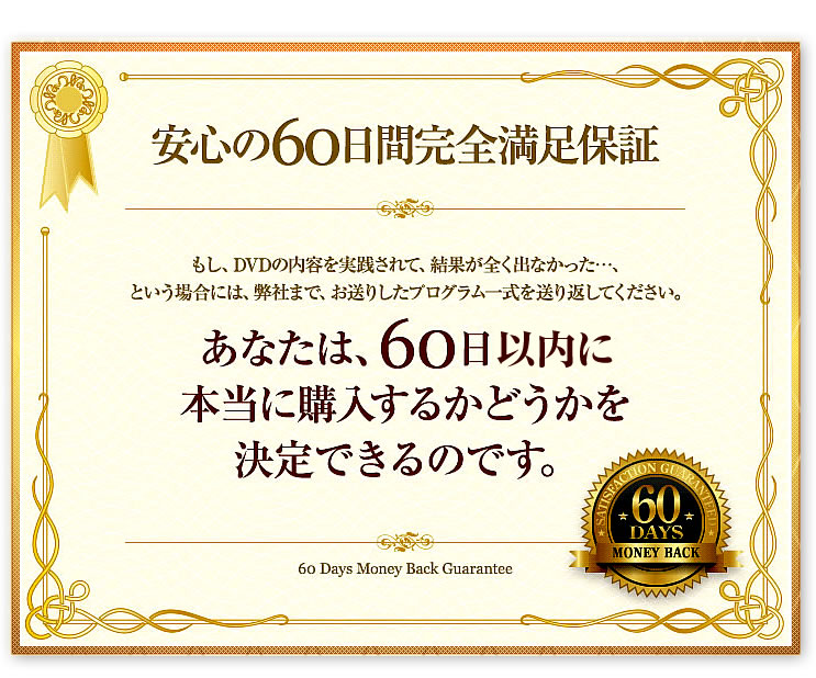 もし、DVDを購入して頂き、何ひとつ参考になることがなかった、あるいは実践したにも関わらず効果がみられないということであれば、弊社商品配送日から60日以内(必着)であれば、全額返金します。