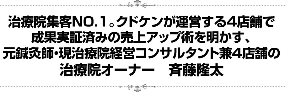 今回ご紹介するノウハウは、クドケンが売上アップに導いた店舗経営のノウハウに加えて、日本一の治療院専門ホームページ会社として培ってきたノウハウを惜しみなく公開しているためです。